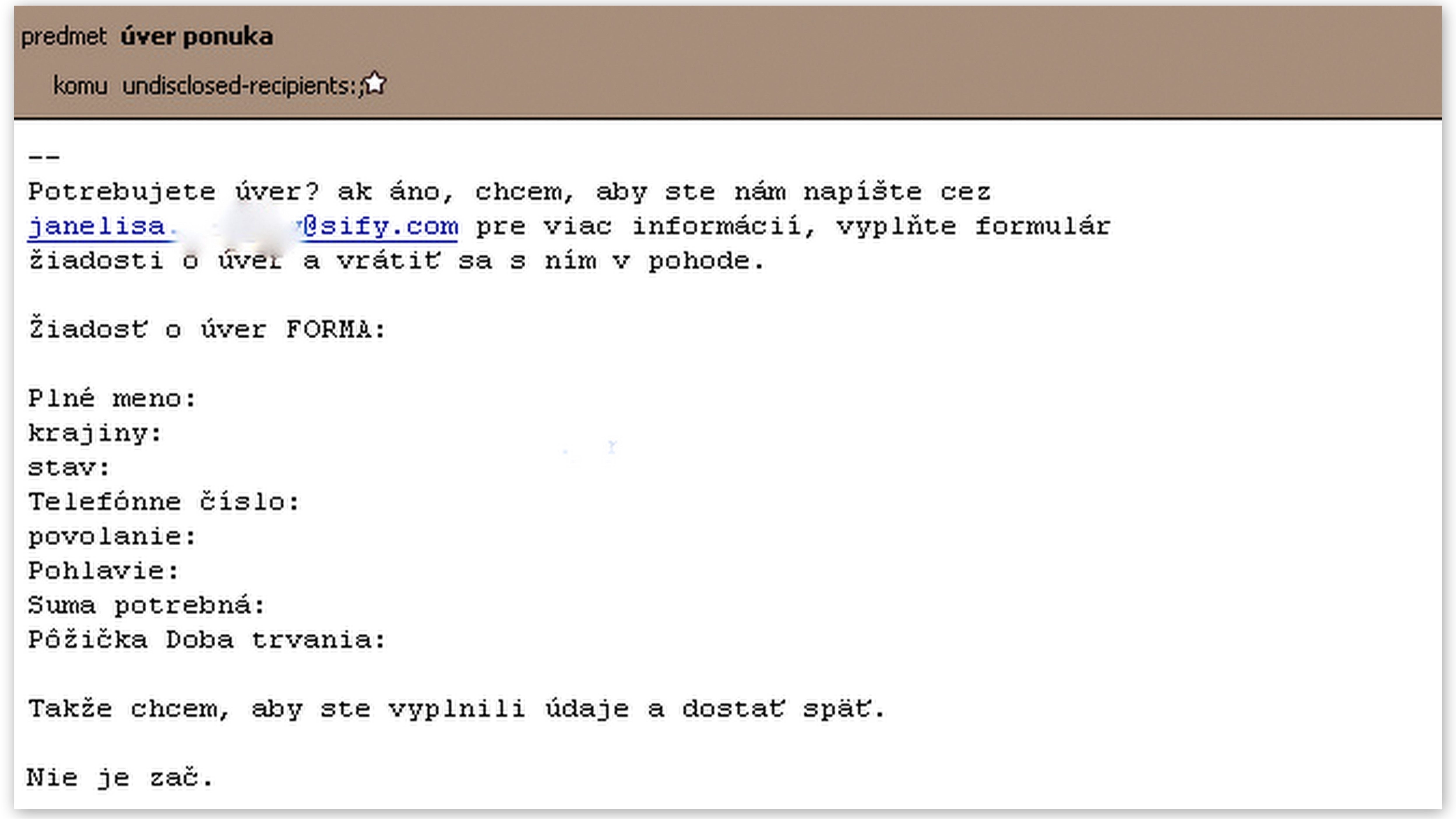 ,"Potrebujete úver? Ak áno, chcem, aby ste nám napíšte pre viac informácií, vyplňte formulár žiadosti o úver a vrátiť sa s ním v pohode. Takže chcem, aby ste vyplnili údaje a dostať späť. Nie je zač." Toto je určite ponuka zo zahraničia. Zlá gramatika, žiadne skloňovanie. Aj takto viete rozoznať podvodníka.