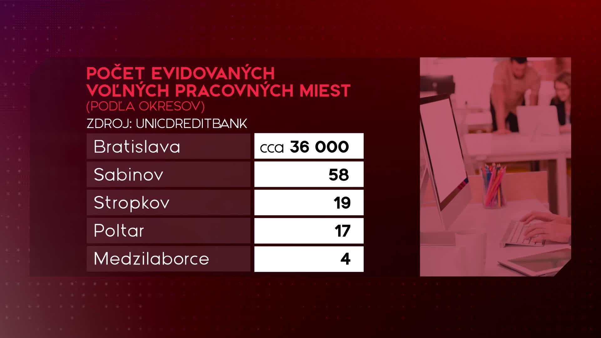 Kým v Bratislave a okolí je voľných pracovných miest okolo 36-tisíc, tak v okrese Sabinov 58, Stropkove 19 a v Poltári 17 a v okrese Medzilaborce len 4.