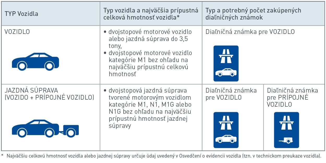 Musí byť zakúpená pre vozidlo a v prípade jazdnej súpravy nad 3,5 tony aj pre prípojné vozidlo. Typ aj potrebný počet diaľničných známok v závislosti od typu a najväčšej prípustnej hmotnosti vozidla znázorňuje nasledujúca tabuľka.