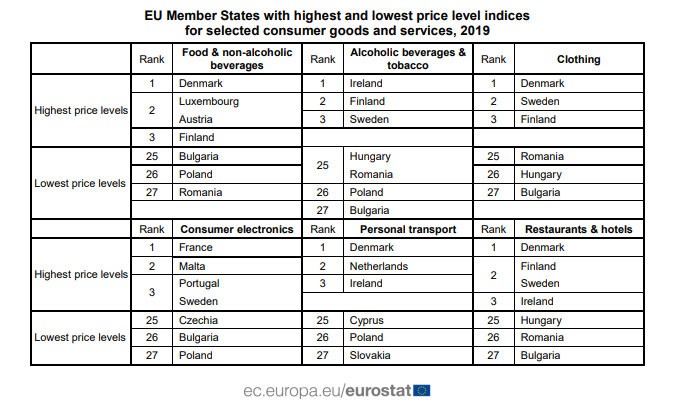 Alkohol a cigarety sú najdrahšie v Nórsku. Dánsko bolo za vlaňajšok jedným z najdrahších v prípade cien oblečenia, nábytku či doplnkov do domácnosti, dopravy a rekreácie, kultúry a v cenách v reštauráciách a hoteloch.