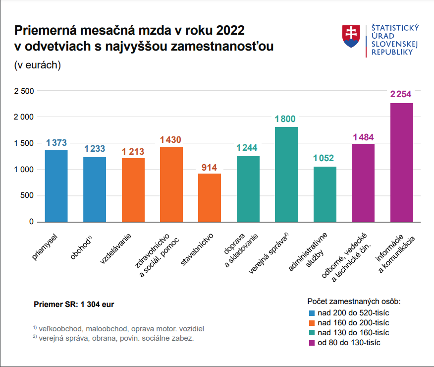 Priemerná mesačná mzda v roku 2022 v odvetviach s najvyššou zamestnanosťou