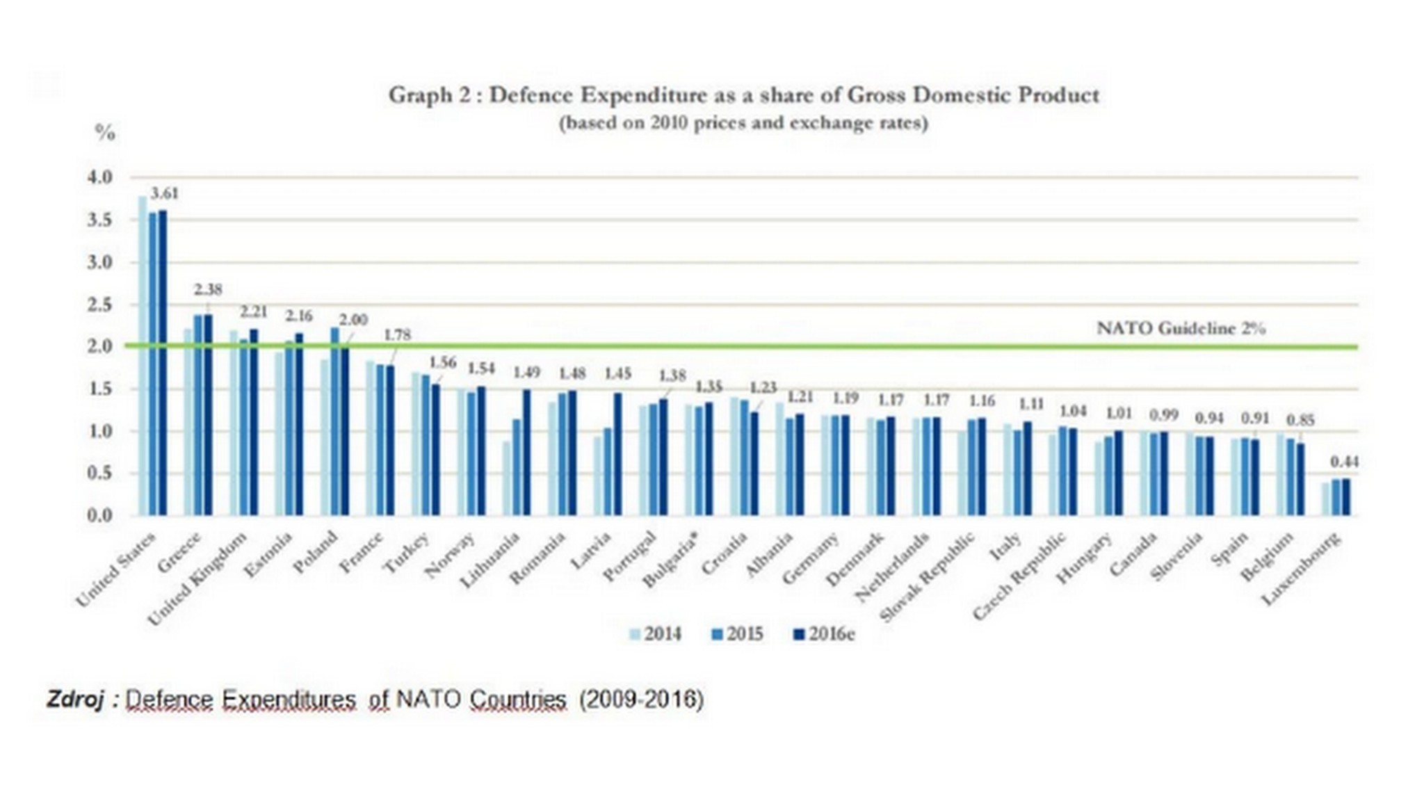 Sme „lídrami“ poslednej tretiny krajín NATO. Toto umiestnenie nás rozhodne nectí a nič na tom nemení ani skutočnosť, že za nami je „až“ osem krajín. Skôr je na pováženie, že pred Slovenskom sú aj také krajiny, ako je Albánsko, Bulharsko, Rumunsko a podobne. Taktiež sa nemôžeme uspokojovať s tým, že za posledné tri roky rozpočet rastie, lebo je to nárast len mikroskopický, skôr by sa žiadal nárast ako v prípade, Litvy, Lotyšska alebo Portugalska.