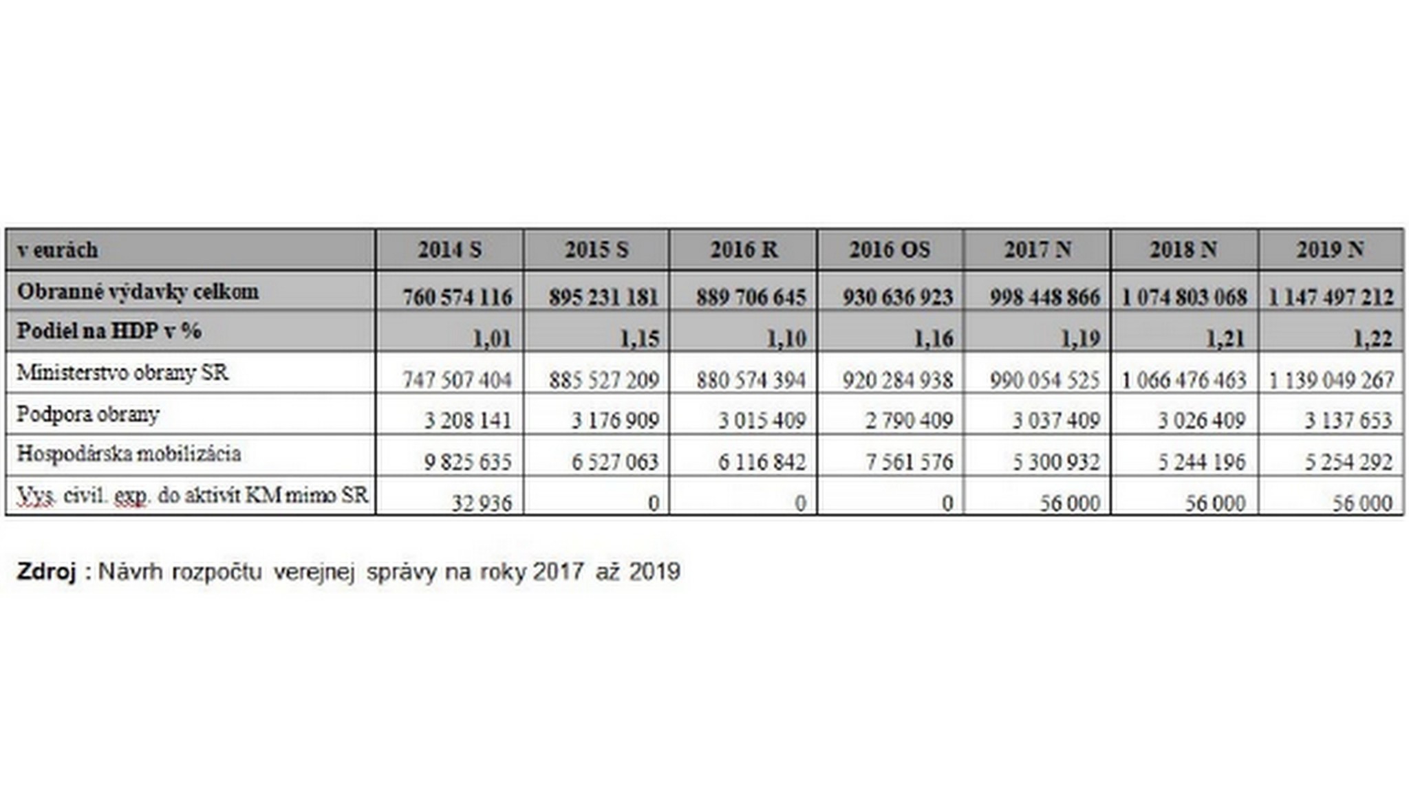 A to ešte treba spomenúť, že si v štatistike takpovediac trocha „pomáhame“ tak, že do rozpočtu obrany počítame aj výdavky ostatných rozpočtových kapitol v rámci medzirezortných programov Podpora obrany, Hospodárska mobilizácia a Vysielanie civilných expertov do aktivít krízového manažmentu mimo územia SR. To nie je úplne korektné. Ak by sme rátali len čisté peniaze pre ministerstvo obrany, percento k HDP by bolo nižšie.