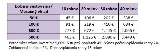 Ak by ste napríklad investovali 100 eur mesačne po dobu 30 rokov, na dôchodku by ste si mohli nechať vyplácať mesačne sumu 410 eur po dobu 15 rokov. Keďže ide o investovanie, je potrebné počítať aj s výkyvmi na finančných trhoch. No v ruke máme silného žolíka a tým je čas. Pokiaľ investujeme v horizonte niekoľkých desiatok rokov, program pravidelného investovania do podielových fondov alebo vhodne zvolené investičné životné poistenie sú rozumný a bezpečný spôsob, ako si dlhodobo vytvárať aktíva.