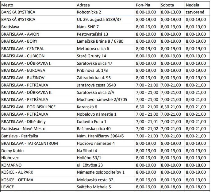 - od 14.3.2020 majú predajne v nákupných centrách dočasne zmenené otváracie hodiny