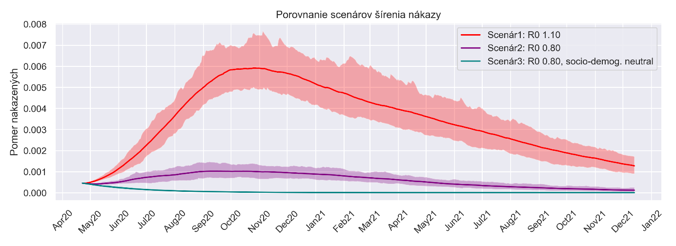 Z troch kriviek vybrali ako najreálnejšiu a základnú označenú fialovou farbou. "Fialová hovorí, že keby sme izolovali časť ľudí nad 70 rokov, ako by to vyzeralo. V praxi nie veľký rozdiel, ale v počte infikovaných, ale úmrtnosť o 40 percent menej," dodáva Smatana.