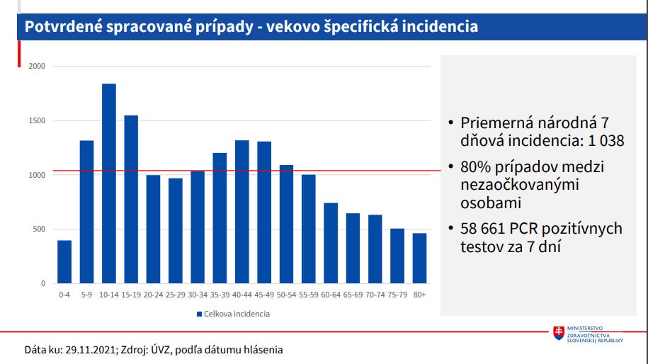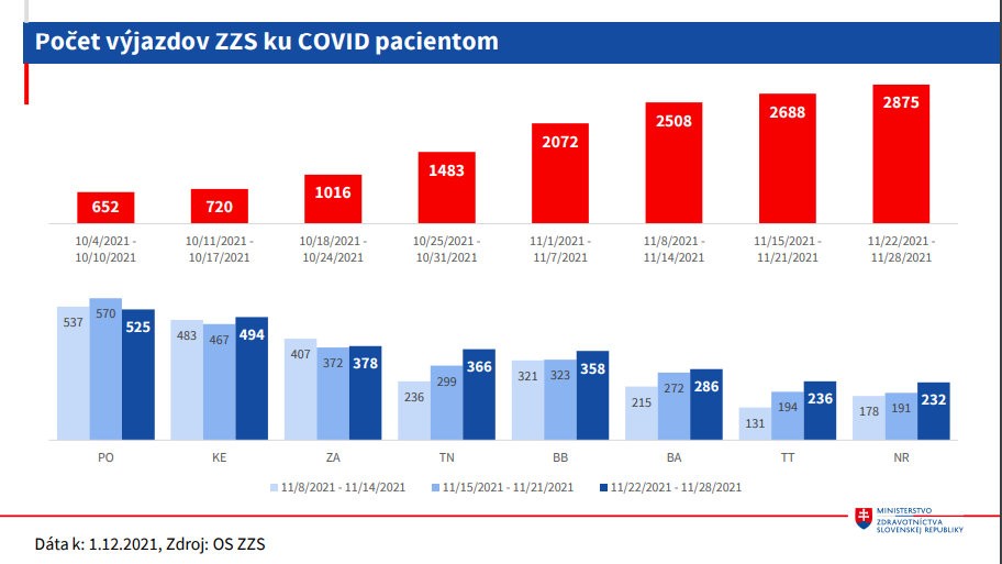 V nemocniciach je 3394 pacientov s COVID-19, na jednotke intenzívnej starostlivosti a oddelení anestéziológie a intenzívnej medicíny je 600 pacientov, podporu umelej pľúcnej ventilácie potrebuje 291 ľudí. Viac ako 82 percent z nich nie je zaočkovaných, alebo má len jednu dávku očkovacej látky. V nemocniciach je podľa NCZI najviac pacientov s COVID-19 vo veku nad 65 rokov.