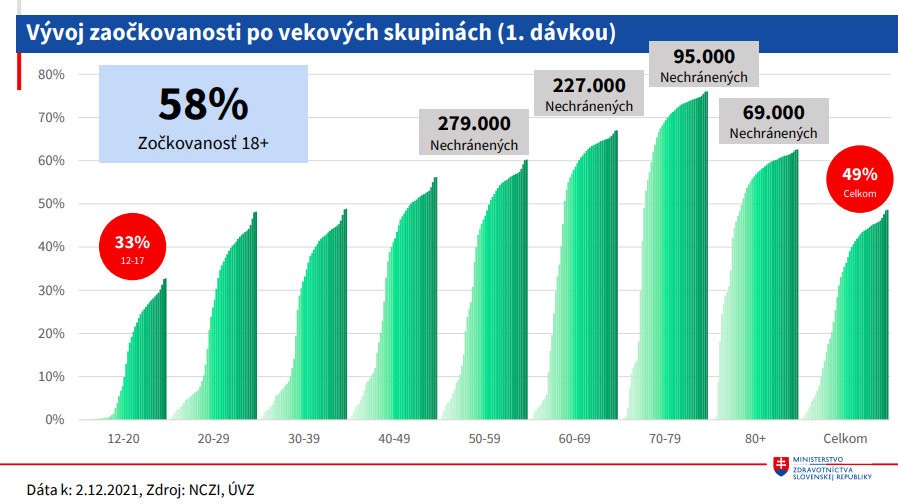 Prvú dávku očkovacej látky dostalo 2 648 585 ľudí, medzi dospelými je zaočkovaných aspoň prvou dávkou už 58 percent populácie. Druhú dávku vakcíny dostalo 2 348 320 osôb v našej krajine, tretiu dávku 430 894 ľudí.