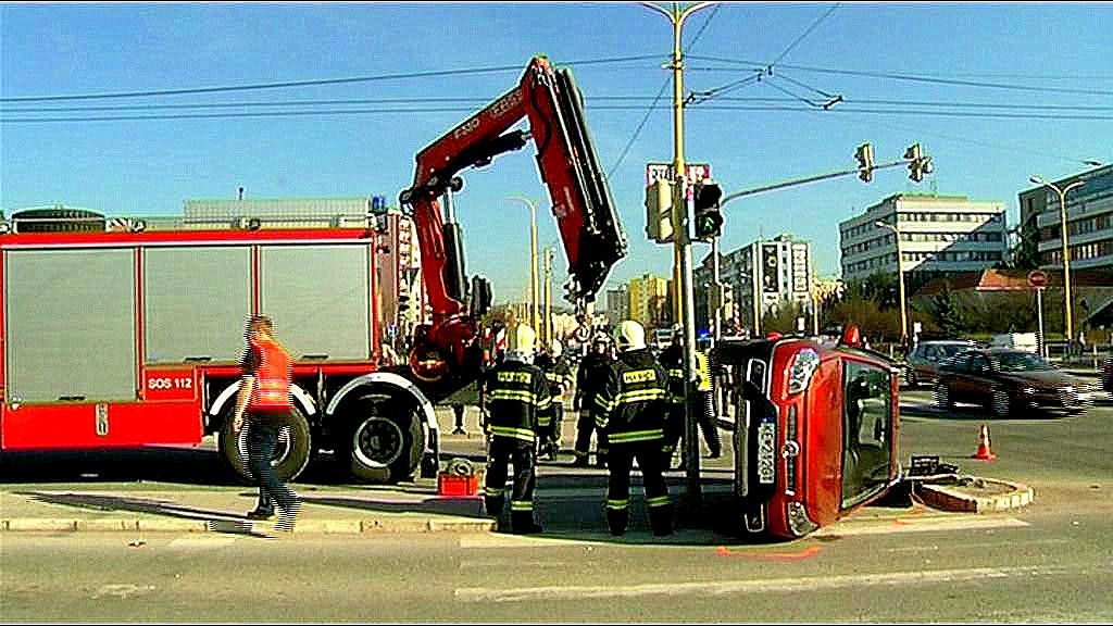 Vodička Fiatu zrejme prešla cez križovatku na červenú. Zrazila sa s ďalším autom. Náraz bol taký silný, že Fiat zostal prevrátený na boku tesne pri stĺpe svetelnej signalizácie. Auto poškodilo aj dopravnú značku.