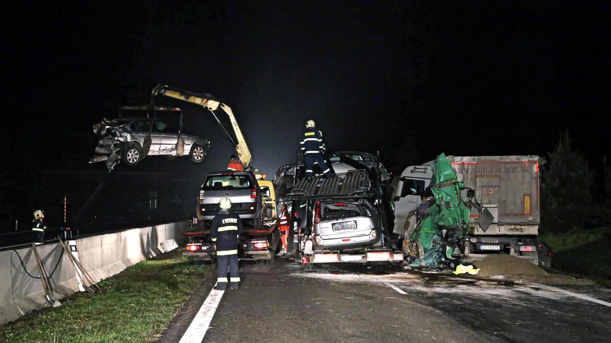Nehodu podľa polície spôsobil 41-ročný kamionista, ktorý mal v návese 8 áut. Zatiaľ nie je jasné prečo, no na rovnom úseku cestu narazil do pred ním idúceho nákladiaku so štrkom. Tretí, plne naložený kamión už jednoducho neubrzdil. "Neviem čo sa stalo, je to rovná cesta. Zrazu som videl pred sebou náraz, kamión po ňom odhodilo do protismeru," dodáva kamionista.