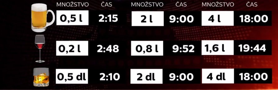 Pol litra piva sa nám v krvi drží približne dve a štvrť hodiny. Dve deci vína skoro tri hodiny a pol deci tvrdého alkoholu viac ako dve hodiny. Ak si už dáme 4 veľké pivá alkohol sa drží v tele aj 9 hodín. Pri 8 deci vína takmer 10 hodín a pri 2 decilitroch liehoviny 9 hodín. Poriadne dlho si nemôžte sadnúť za volant napríklad po poriadnej oslave. 8 pív vychádza až na 18 hodín, 1,6 litra vína na skoro 20 hodín a 4 decilitre tvrdého na 18 hodín. Samozrejme, už malé požitie alkoholických nápojov ovplyvňuje vašu jazdu.