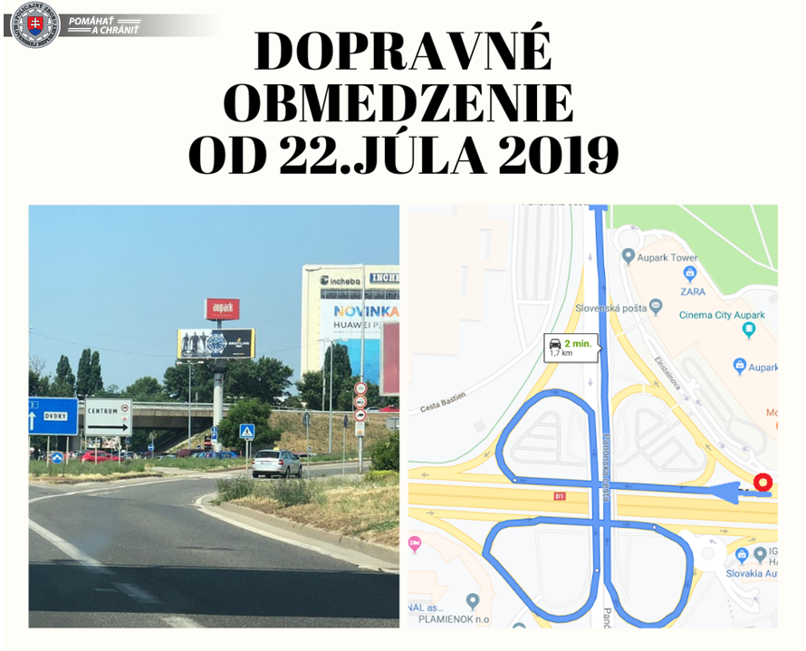 Policajti upozorňujú na dopravné obmedzenia na frekventovanej Einsteinovej ulici. Pre opravy poškodeného krytu vozovky a položenie nového asfaltového povrchu nebude od pondelka 22.júla 2019 od 10.00 hod prejazdný výjazd na most SNP zo smeru od Einsteinovej ulice. "Dopravné obmedzenie bude trvať pravdepodobne do 27.júla 2019. Obchádzková trasa bude vyznačená dopravným značením. Účastníkov cestnej premávky touto cestou žiadame, aby pri prejazde uvedeným úsekom zvýšili pozornosť a opatrnosť, prípadne riadili sa pokynmi policajtov," informovala polícia.