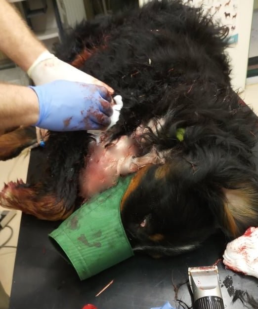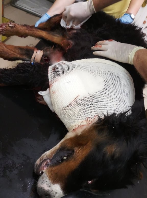 "Krvácal, v šoku, v obrovských bolestiach. Sme ho sledovali, sme zaviedli protišokovú terapiu na zastavenie krvácania, strela proste zlomila ramennú kosť a spôsobila devastáciu mäkkých tkanív," hovorí veterinár Gaál Ondrej. "Polícia prijala trestné oznámenie v súvislosti s postrelením bernského salašníckeho psa a všetky okolnosti streľby, ako aj poranenia psa, preverujeme," uviedla hovorkyňa nitrianskej polície Martina Kredatusová.