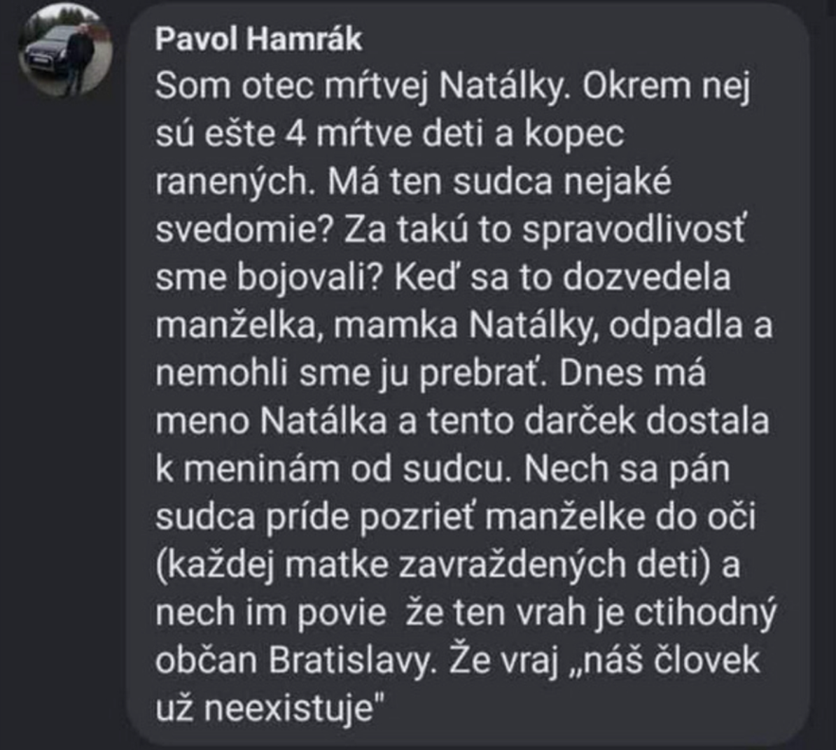 "Keď sa to dozvedela manželka, mamka Natálky, odpadla a nemohli sme ju prebrať," uviedol Pavol Hamrák v komentári na Facebooku. Vyjadril svoje znechutenie nad verdiktom súdu. "Nech sa pán sudca príde pozrieť manželke do očí (každej matke zavraždených detí) a nech im povie, že ten vrah je ctihodný občan Bratislavy," dodal.