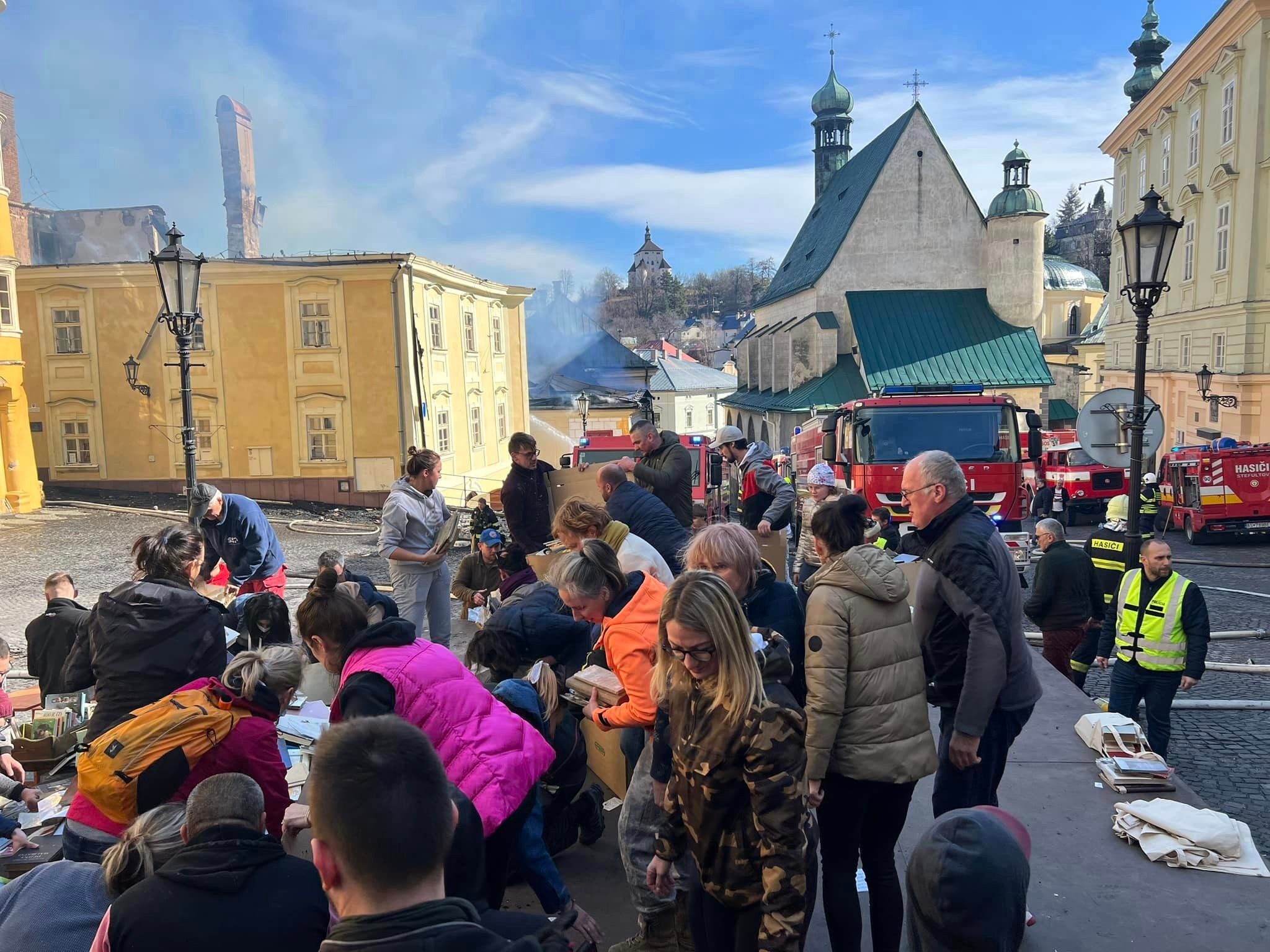 Z Galérie Jozefa Kollára vyberali desiatky dobrovoľníkov obrazy aj sochy a snažili sa ich dostať do bezpečia, pretože oheň sa veľmi rýchlo šíril. Budovy stoja jedna vedľa druhej a kým ráno to bola ešte jedna budova - Banka Lásky, potom sa chytila budova banského archívu, dostalo sa to aj na budovu ZUŠ, na ktorej strechu opravili iba pred rokom.