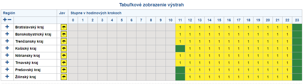 Výstraha platí pre celý Bratislavský, Nitriansky, Trnavský, Trenčiansky aj Banskobystrický kraj. Tiež vo viacerých okresov Košického kraja a okresoch Poprad, Kežmarok a Levoča. Priebežne trvá do 22.00 h.