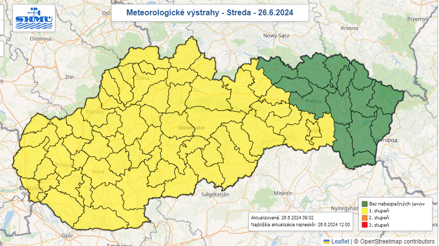 BRATISLAVA / Na väčšine miest Slovenska treba počas stredy (26.6.) počítať s búrkami. Môžu byť sprevádzané prudkým lejakom, krúpami a nárazovým vetrom. Slovenský hydrometeorologický ústav (SHMÚ) vydal výstrahu prvého stupňa, informuje o tom na svojom webe.