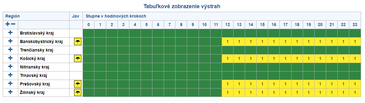 Prvý stupeň výstrah pred búrkami platí na celom území predbežne do 20.00 h. SHMÚ upozorňuje, že sa môžu vyskytnúť búrky spojené s prudkým lejakom s intenzitou dvadsať až tridsať milimetrov za tridsať minút, krúpami a s nárazovým vetrom, ktorý môže dosiahnuť rýchlosť 65 až 85 kilometrov za hodinu. Zároveň pre okresy Spišská Nová Ves a Gelnica platí druhý stupeň výstrahy pred prívalovými povodňami. Prvý stupeň je vydaný pre okresy Levoča, Sabinov a Prešov.