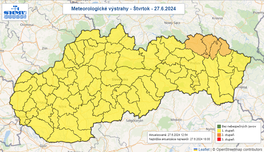 BRATISLAVA / Na celom území Slovenska treba počas štvrtka (27.6.) počítať s búrkami. Slovenský hydrometeorologický ústav vydal v tejto súvislosti výstrahy prvého stupňa. V niektorých okresoch východného Slovenska tiež platia výstrahy prvého a druhého stupňa pred povodňami. SHMÚ o tom informuje na svojom webe.