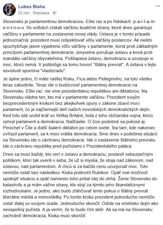 "Posledné, čo teraz potrebujeme, sú nekonečné diskusie a podozrenia, kto bol s kým na motorkách či oslavách narodenín. Ako hlava štátu to nepripustím. Toto nie je cesta k obnoveniu dôvery," pokračoval prezident. Celý prejav uzavrel silnými slovami: "Ak má nová vláda záujem obnoviť dôveru ľudí v štát, musíme mať na jej obsadenie prísne nároky."