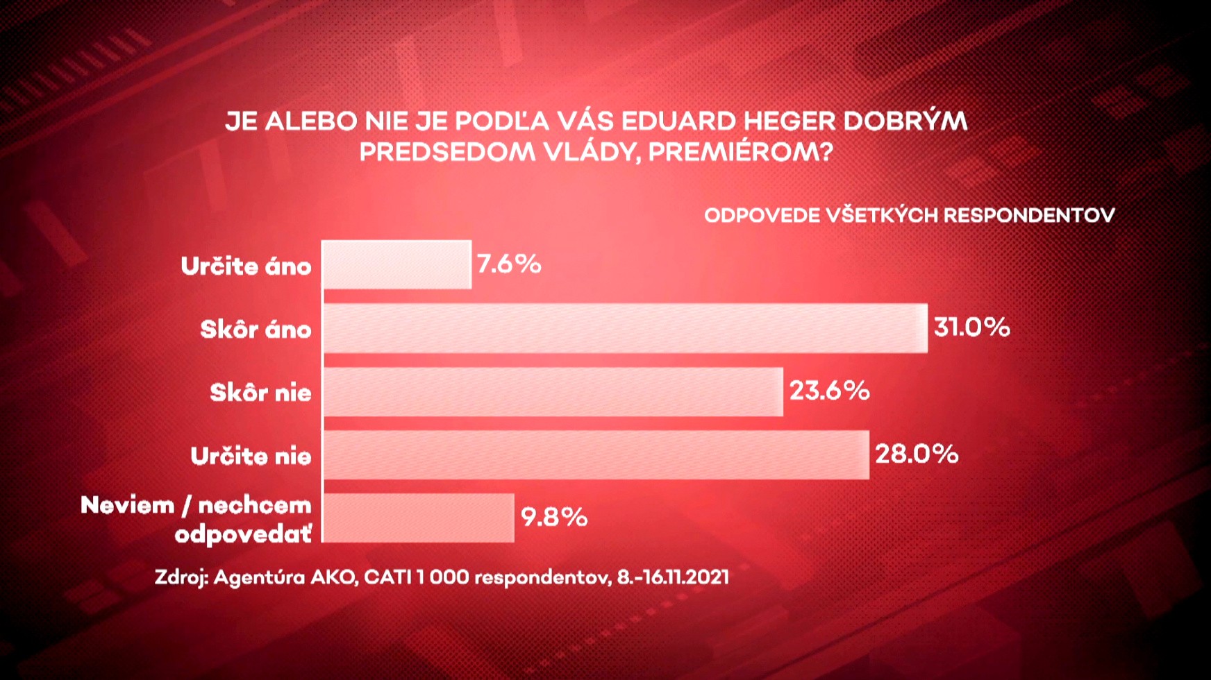 Z prieskumu vyplýva, že 23,6 percenta Slovákov si myslí, že Eduard Heger skôr nie je dobrý premiér. Určite nie je dobrý premiér si myslí 28 percent opýtaných. Eduarda Hegera za dobrého premiéra považujú približne štyria z desiatich. ( spolu 38,6%, určite áno:7,6 %, skôr áno: 31 %).