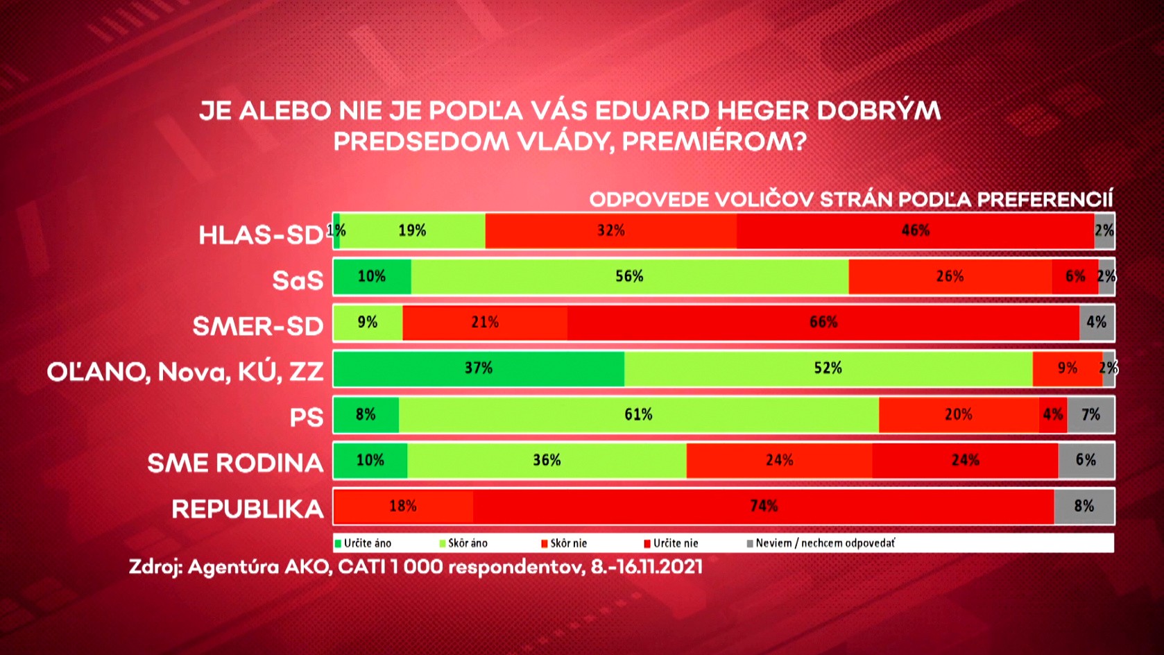 Medzi priaznivcami Smer-SD sa našlo 9 percent ľudí, ktorí sú s Hegerom spokojní. Podľa 87 percent opýtaných (skôr nie: 21%, určite nie: 66 %) nie je Eduard Heger dobrým premiérom.