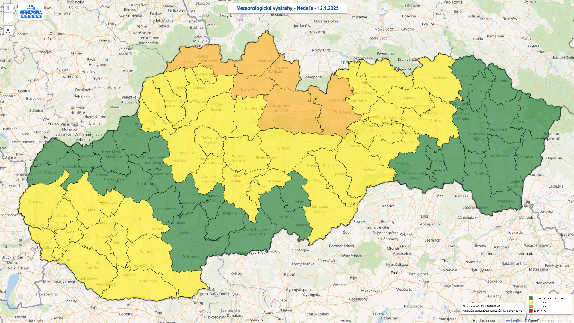 Výstraha druhého stupňa pred snežením platí až do polnoci v Prešovskom a Žilinskom kraji. Očakáva sa, že napadne ďalších 15 až 20 centimetrov snehu. SHMÚ varuje aj pred tvorbou snehových jazykov a závejov, a to v Banskobystrickom, Trenčianskom, Košickom, Prešovskom a Žilinskom kraji.