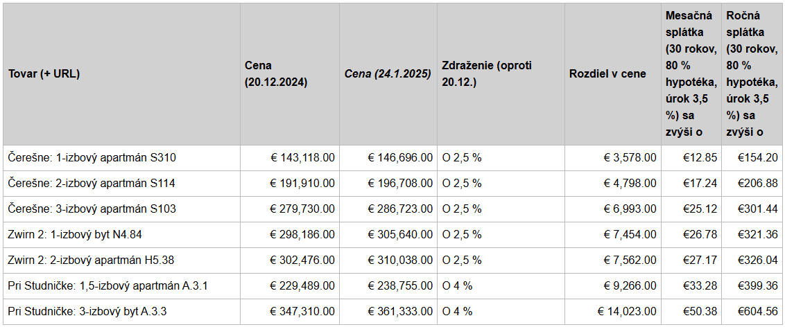 Čerešne, novostavby v bratislavskej Dúbravke. Ak ste rozmýšľali nad kúpou, no čakali na nový rok, tak si za to doslova zaplatíte. Jeden mesiac znamenal rozdiel 2 a pol percenta, pri trojizbovom byte to je 7 000 eur. Ešte horšie to je tu - Pri studničke. Byty síce ešte nestoja, no cena rastie, a to o štyri percentá. "Z pohľadu realitného trhu ako takého to nejaký zásadný vplyv nemá, dopyt je stále veľmi silný," uviedol prezident Národnej asociácie realitných kancelárií Ján Palenčár.