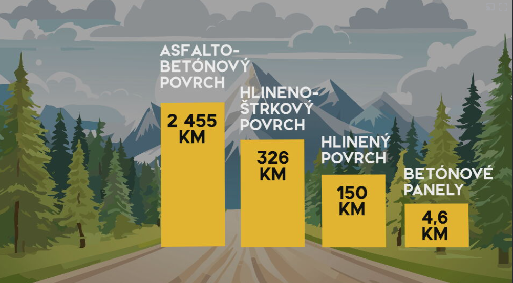 Pasportizácia ukázala, že prevládajú trasy s asfalto-betónovým povrchom (takmer 2 500 km). Nasledujú hlinené cesty (cca 330 km), hlineno-štrkové úseky (150 km) a prekvapením je aj nález 4,5 kilometra cyklotrás tvorených betónovými panelmi.