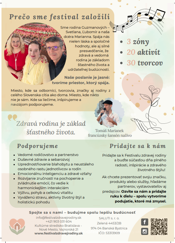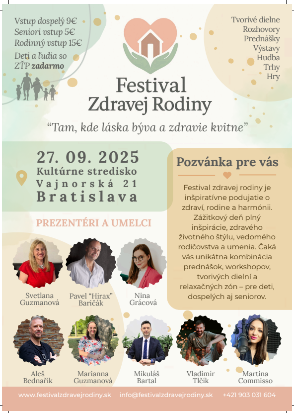 BRATISLAVA / Bratislava zažije poslednú septembrovú sobotu výnimočné podujatie, ktoré spája zdravie, vzťahy, kultúru a rodinu. Festival zdravej rodiny, ktorý sa uskutoční v sobotu 27. septembra v Stredisku kultúry na Vajnorskej 21, vznikol z iniciatívy rodiny Guzmanovcov. Nad podujatím prevzal záštitu Bratislavský samosprávny kraj.