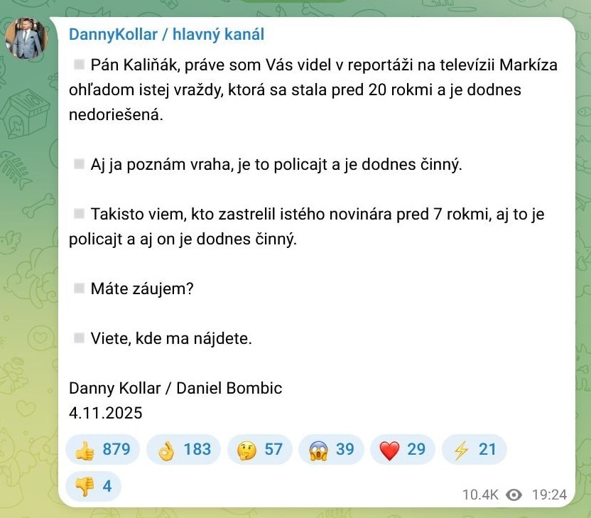 Poznám vraha, ktorý je policajt a je dodnes činný. Rovnako viem, kto zastrelil istého novinára pred siedmimi rokmi, a aj on je policajt a dodnes vykonáva službu, uviedol Bombic vo svojom príspevku, ktorý na Telegrame zverejnil 4. novembra 2025. „Máte záujem? Viete, kde ma nájdete,“ dodal adresne ministrovi.
