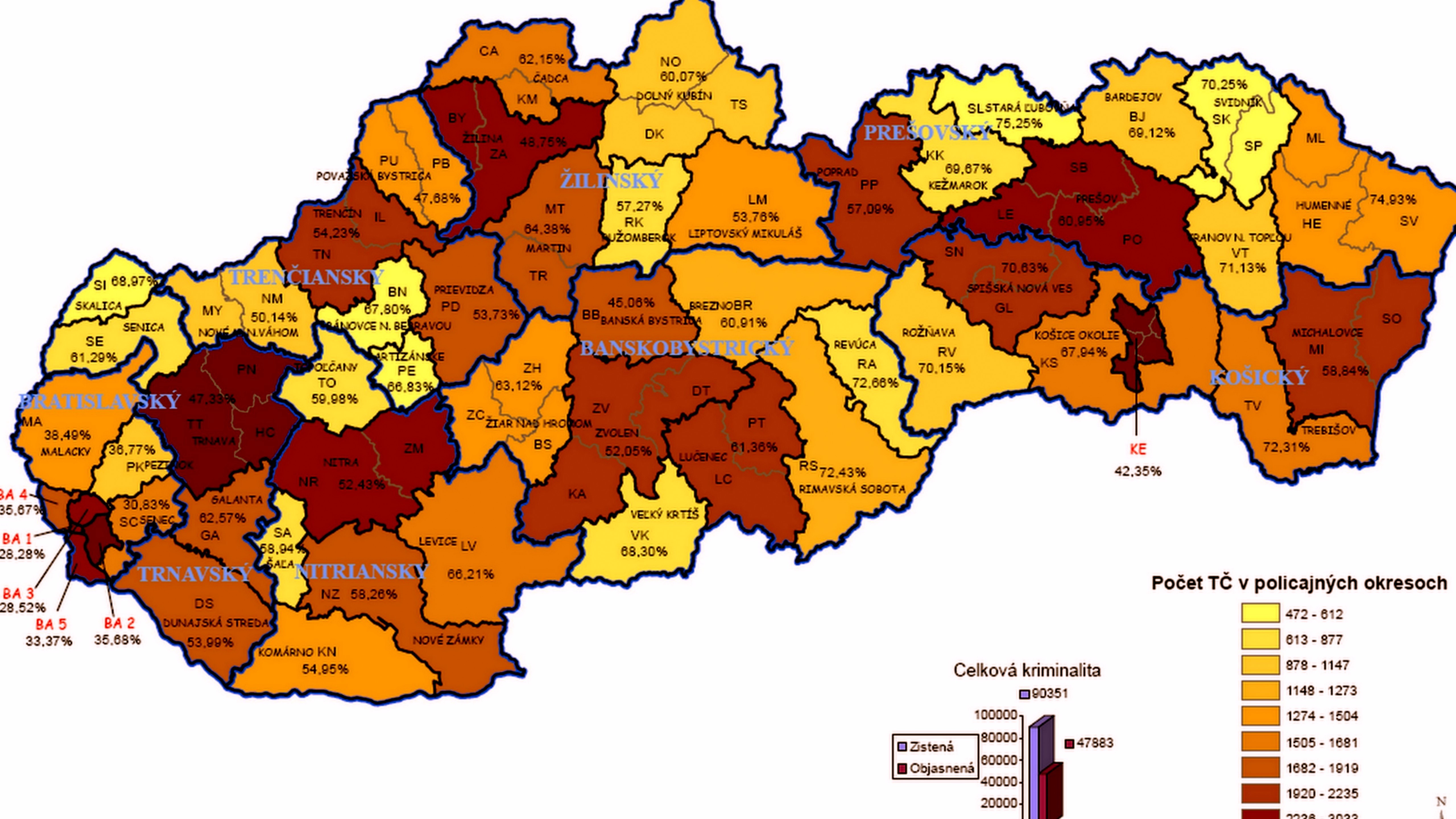 Naopak najväčšia kriminalita je v mestách Košice a Bratislava, konkrétne mestská časť Ružinov. Mapa bola vytvorená na základe počtu trestných činov a ich závažnosti. Napríklad vraždy, lúpeže, znásilnenia, vlámania, krádeže v bytoch, krádeže áut, výbuchy a požiare áut či drogové delikty.