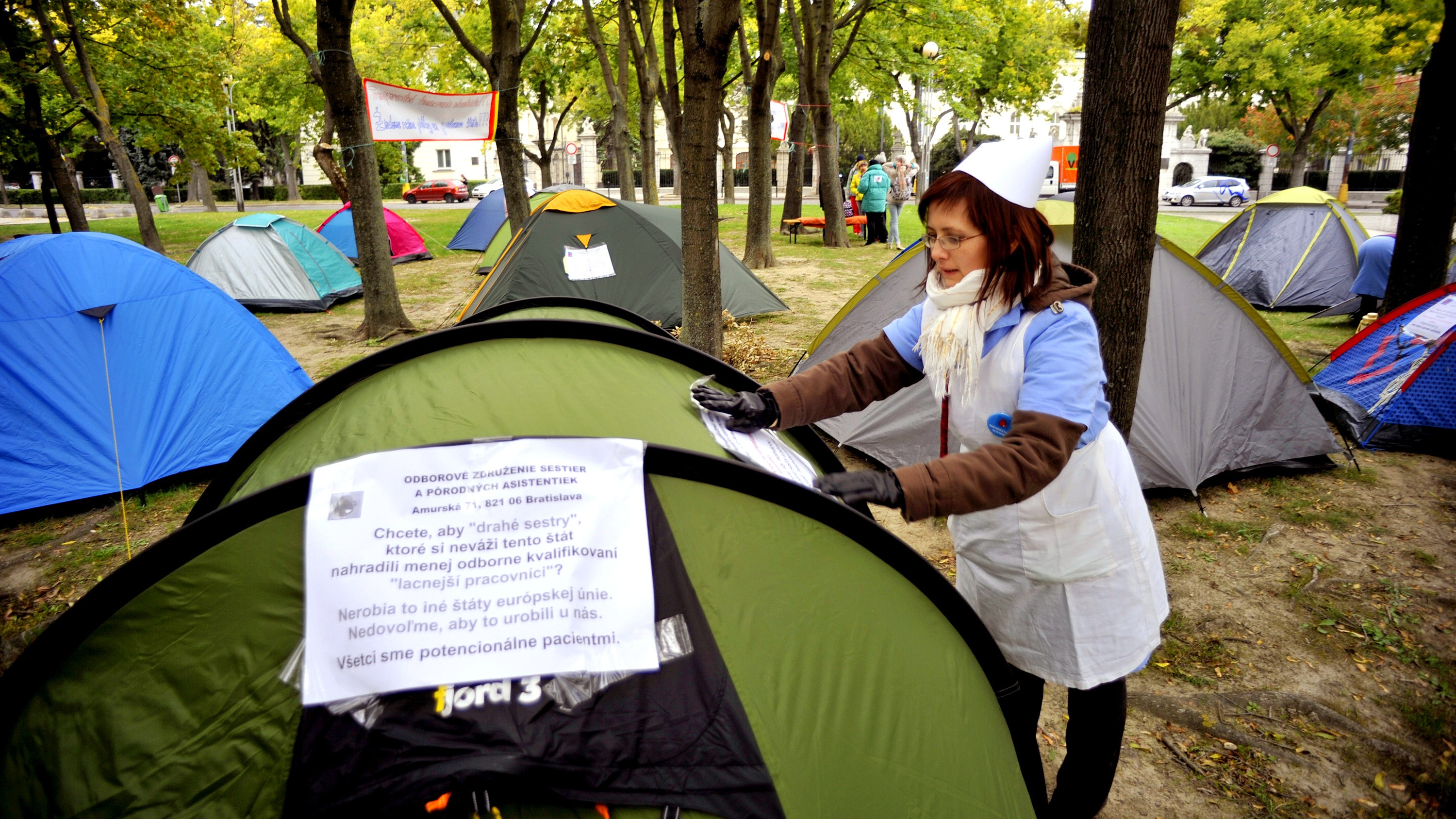 Sestry stanujú na bratislavskom Námestí slobody od stredy. Okrem legislatívnej garancie ich platov požadujú aj riešenie personálnych normatívov v nemocniciach či situácie sestier v zariadeniach sociálnych služieb. Premiérovi Robertovi Ficovi vo štvrtok predložili šesťbodovú deklaráciu, kde zhrnuli všetky svoje požiadavky.
