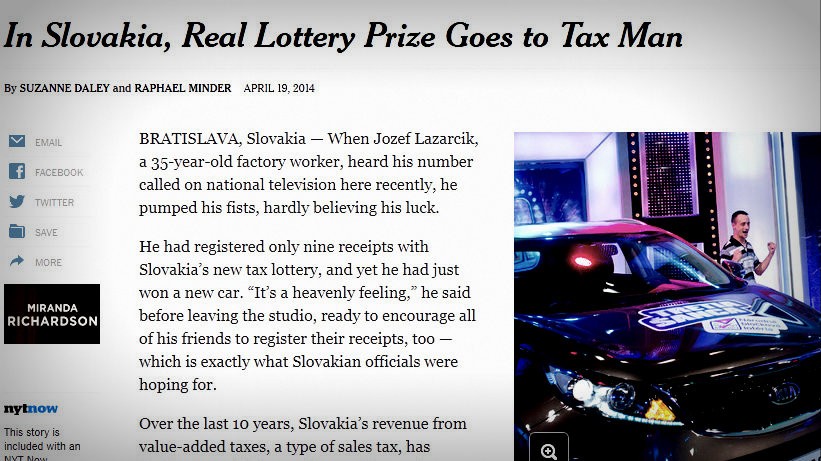 "Slovensko, skutočná výhra v lotérii patrí daňovým poplatníkom. Lotéria má veľký vplyv a uvažujú o nej ďalšie krajiny." Aj takto pozitívne hodnotí slovenskú bločkovú lotériu americký denník New York Times.