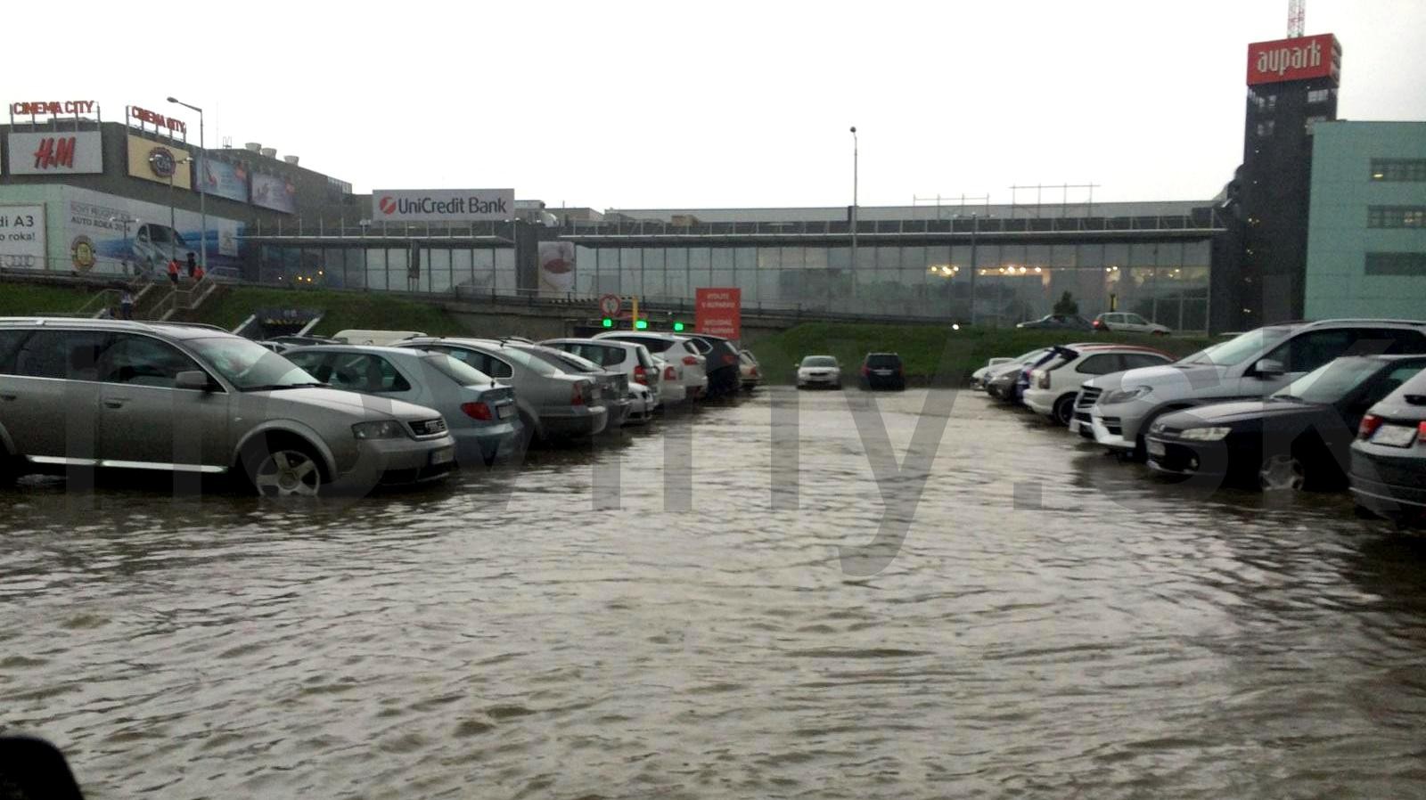 Pod vodou sa ocitlo aj záchytné parkovisko pri bratislavskom nákupnom centre Aupark. Voda bola dokonca aj v nákupnom centre.