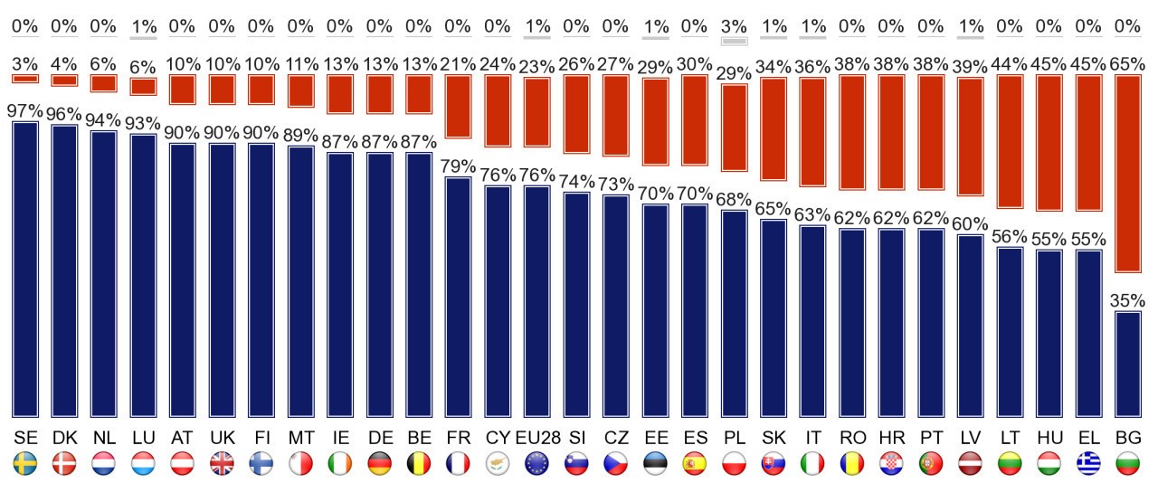 Prieskum tiež ukázal, že Slováci sa už tradične cítia byť občanmi EÚ. Celoeurópsky priemer ukazuje 65 percent, Slováci dosiahli 73.