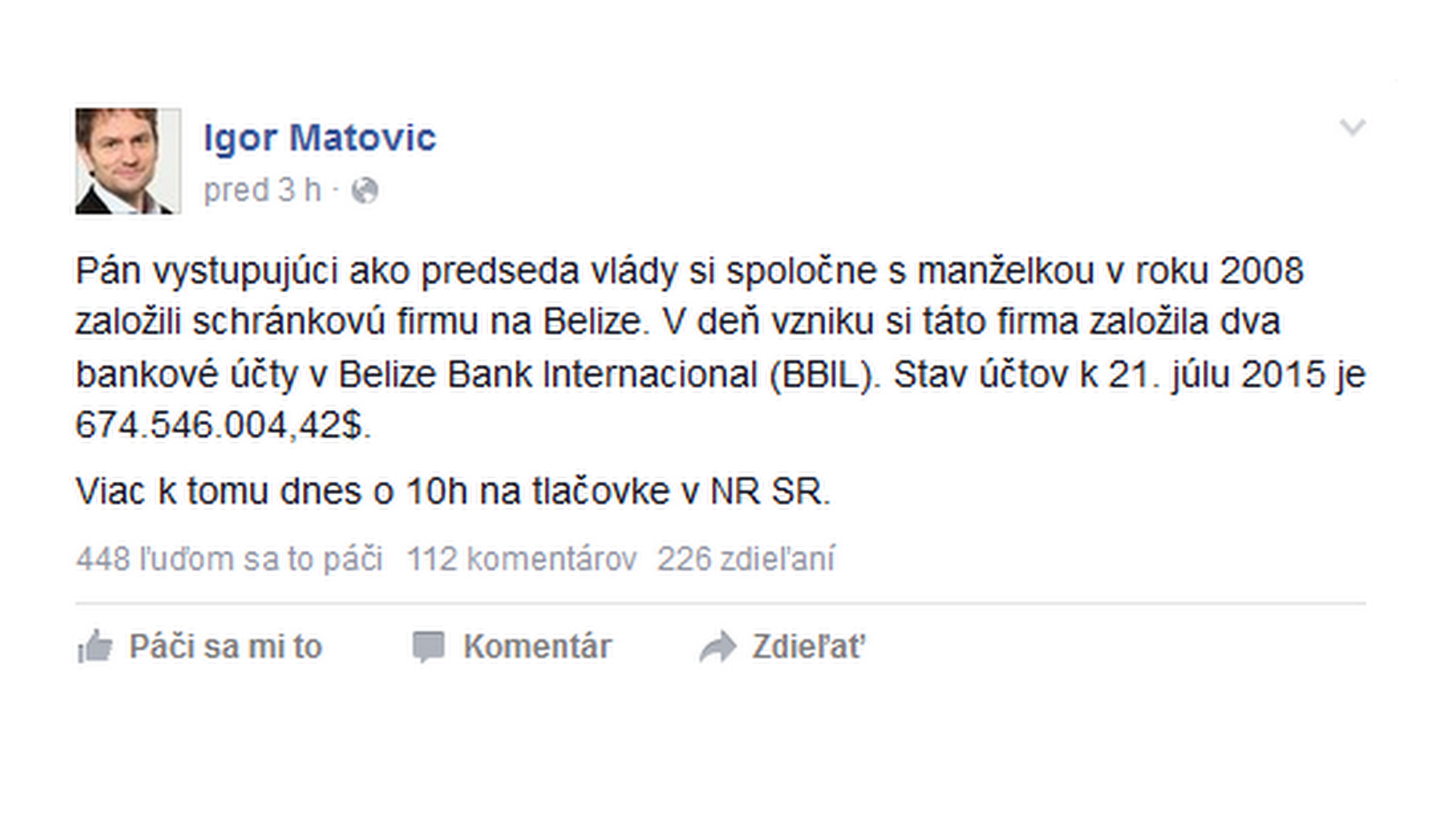 BRATISLAVA / Predseda OĽaNO Igor Matovič naštartoval svojim statusom celodenný slovný súboj. V statuse napísal, že pán vystupujúci ako predseda vlády, si spoločne s manželkou v roku 2008 založili schránkovú firmu na Belize a stav účtov tejto firmy v belizejskej banke je viac ako 674 miliónov dolárov.