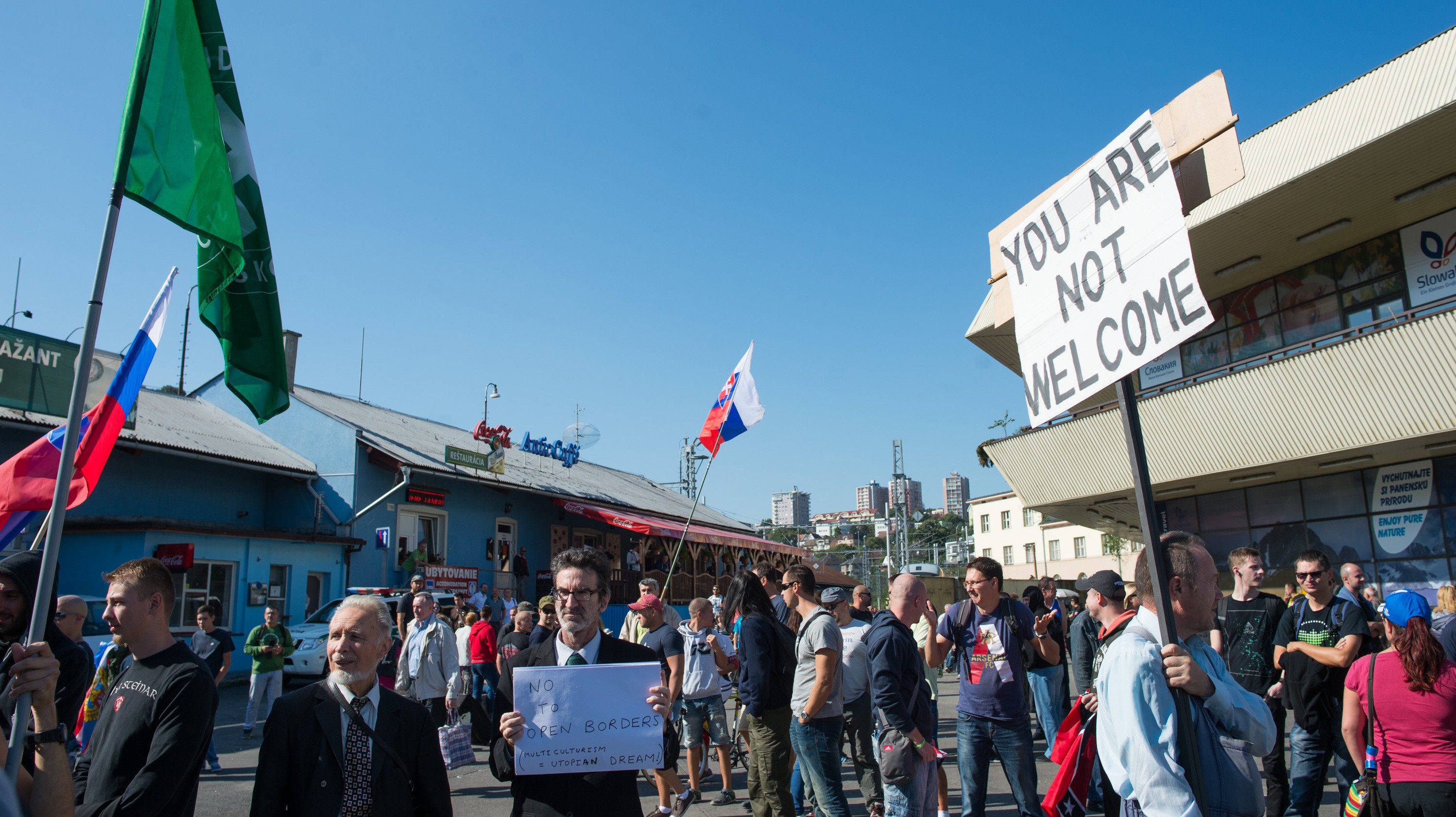 V dave bolo vidieť viaceré transparenty, na ktorých boli heslá ako Stop islamizácii, Slovensko si nedáme či Slovensko nie je Afrika. Nad námestím krúžil i policajný vrtuľník, ktorý účastníci vypískali.