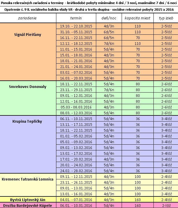 Už od pondelka sa pre verejnosť otvorí rekreačné zariadenie Signál v Piešťanoch, ktoré ponúka 100 voľných miest. Od novembra budú k dispozícii aj zariadenia Smrekovec Donovaly, Krupina Tepličky, Kremenec Tatranská Lomnica a v januári sa na niekoľko dní uvoľní aj Bystrá v Liptovskom Jáne a zariadenie Družba v Bardejovských kúpeloch.