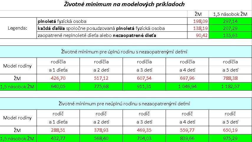 To znamená, že rodina s jedným dieťaťom nemôže mať príjem vyšší ako 640 eur, rodina s dvomi deťmi 775 eur a pri piatich deťoch znamená jeden a pol násobok životného minima 1182 eur.