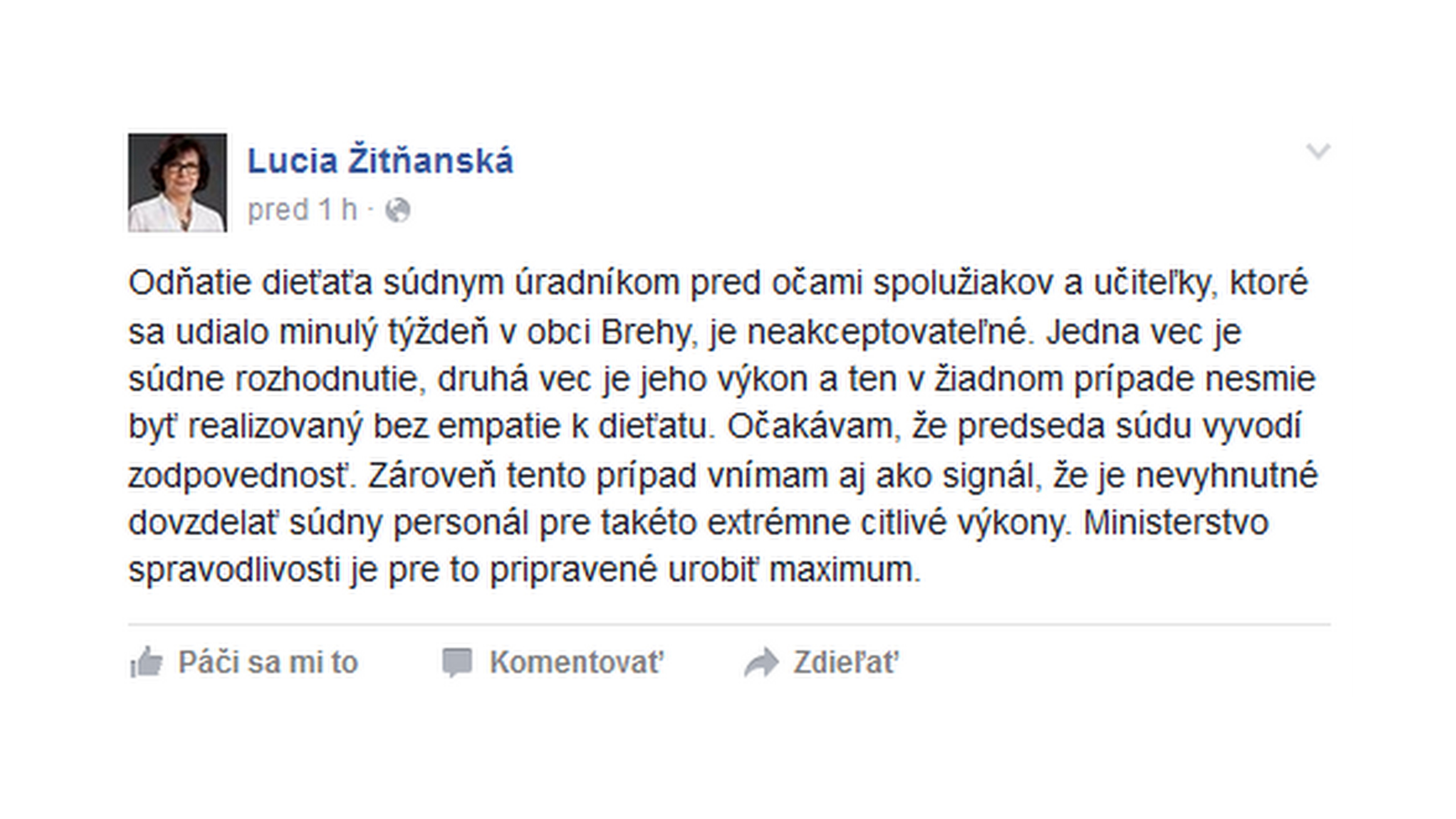 Ministerka spravodlivosti Lucia Žitňanská sa k prípadu vyjadrila aj na facebooku: