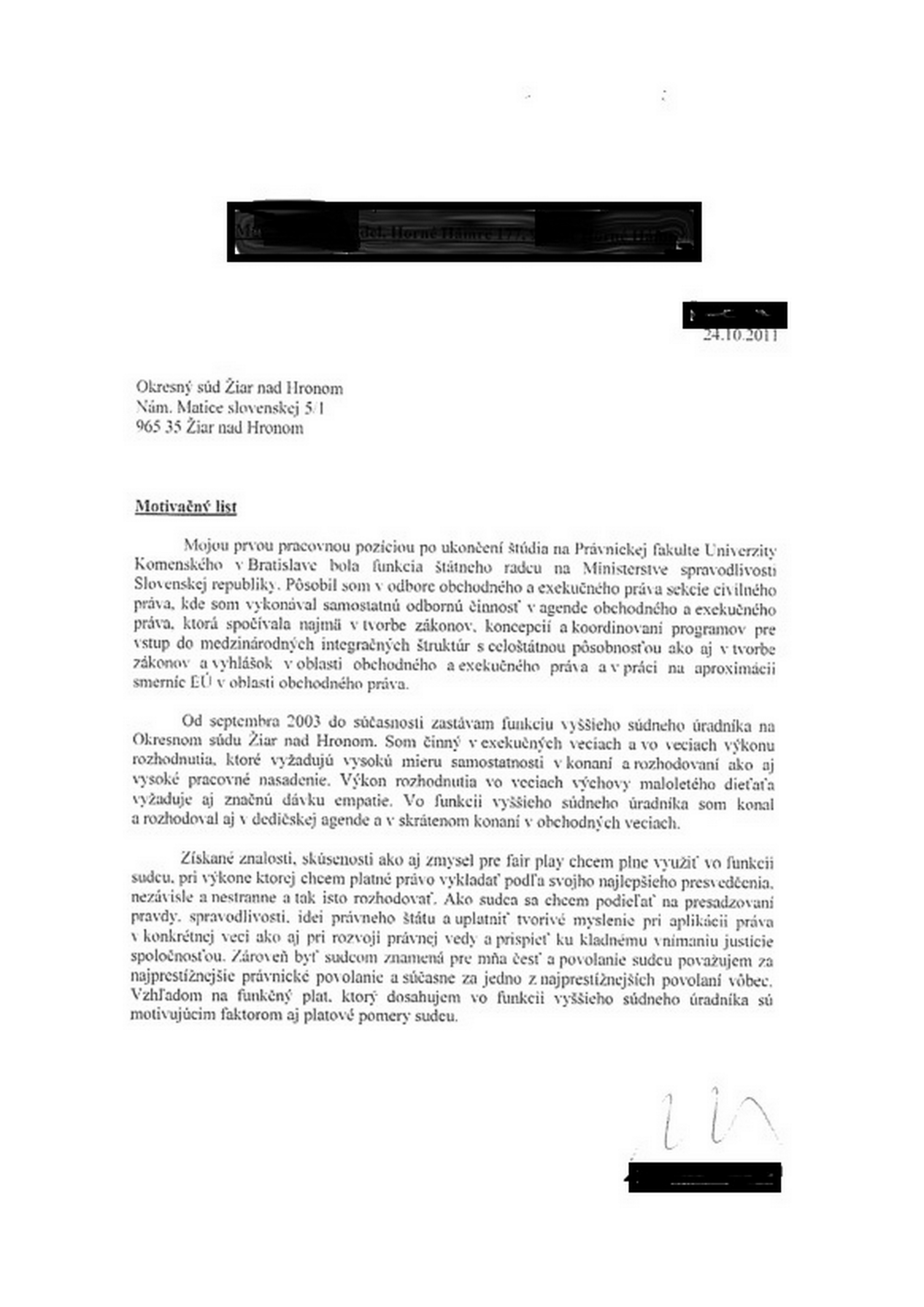 Toto je motivačný list vyššieho súdneho úradníka z roku 2011, kedy sa uchádzal o post sudcu: