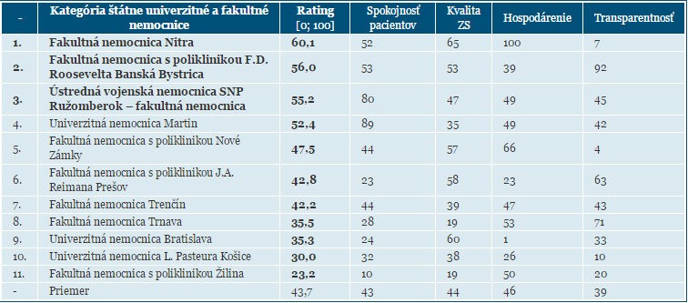 Na poslednom mieste skončila Fakultná nemocnica Žilina, problémom ktorej je spokojnosť pacientov, reoperovanosť, ale aj to, že sa pacienti vracajú na opätovné hospitalizácie, či úmrtnosť na mozgovo-cievne príhody.