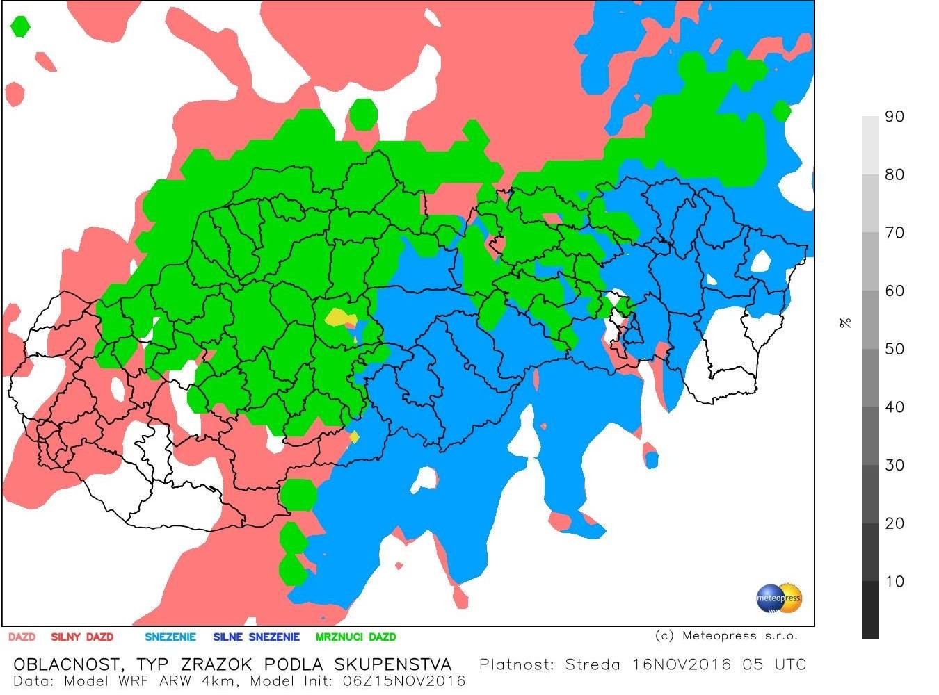 Aj na našom území sa popoludní obloha zatiahla, ale bolo to bez zrážok. Tie by mali na naše územie prísť ešte pred polnocou. Najskôr začne snežiť, ale na západe krajiny sa nad ránom sneženie bude meniť na dážď so snehom a v južných okresoch až na čistý dážď.