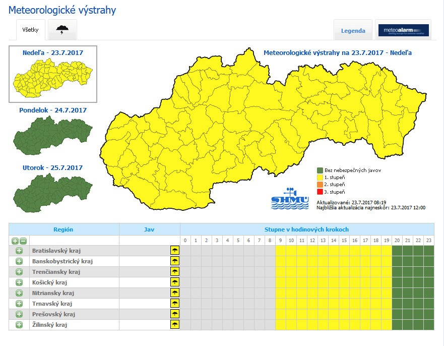 Na západnom Slovensku bude prevažne polooblačno, najvyššie denné teploty od 30 do 33 stupňov. Na strednom Slovensku sa môžu objaviť prehánky a búrky, maximálne denné teploty 28 až 32 stupňov. Rovnaké teploty aj prehánky a búrky môžu očakávať aj obyvatelia východného Slovenska.