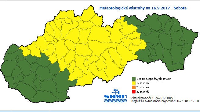 Bez varovaní je len Bratislavský, Nitriansky a Trnavský kraj. Výstrahu prvého stupňa pred silným vetrom a výdatným dažďom vydali meteorológovia pre oblasť už od západoslovenskej Myjavy, cez Trenčín, Žilinu, celé stredné Slovensko, až po Levoču či Gelnicu. Na horách vo výške nad 1500 metrov by mohol vietor dosahovať rýchlosť 90 až 115 kilometrov za hodinu.