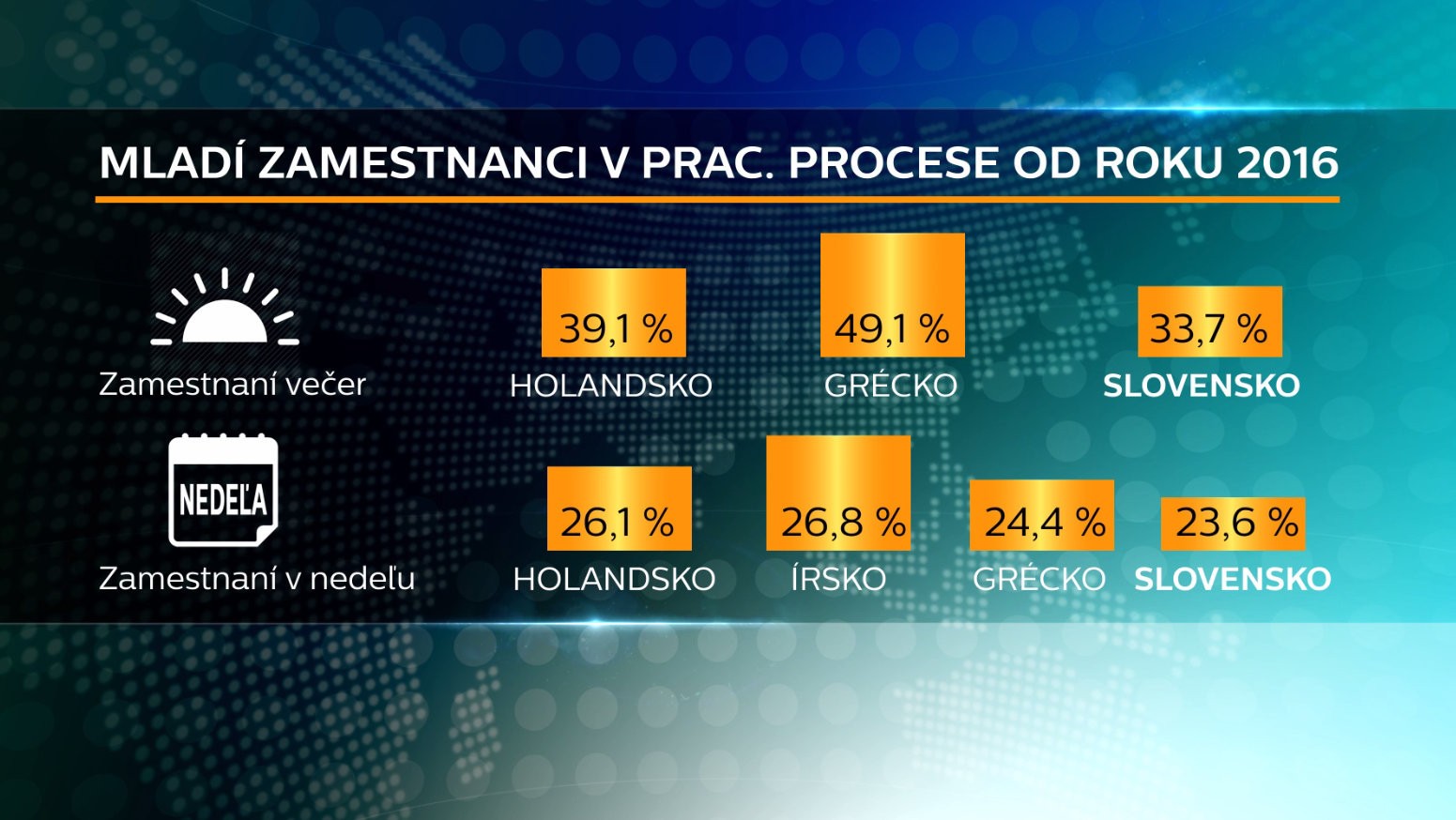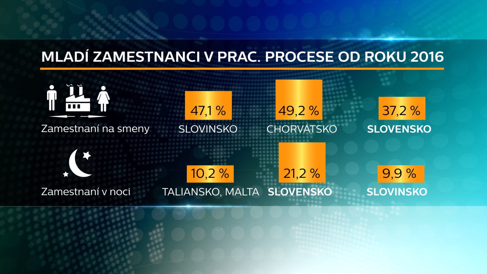 Čo sa týka nočnej práce, tam sme absolútna jednotka. Viac ako 21 percent pracujúcich mladých na Slovensku zarezáva aj v noci. A to veru nie je lichotivé prvenstvo. "Vieme všetci, že nočná práca je dnes oceňovaná rôznymi príplatkami, benefitmi, takže pre mladých ľudí, ktorí začínajú, je to jedna z možností, ako naakumulovať nevyhnutnú bázu, na ktorej štart môžu zahájiť," dodáva Porubänová.