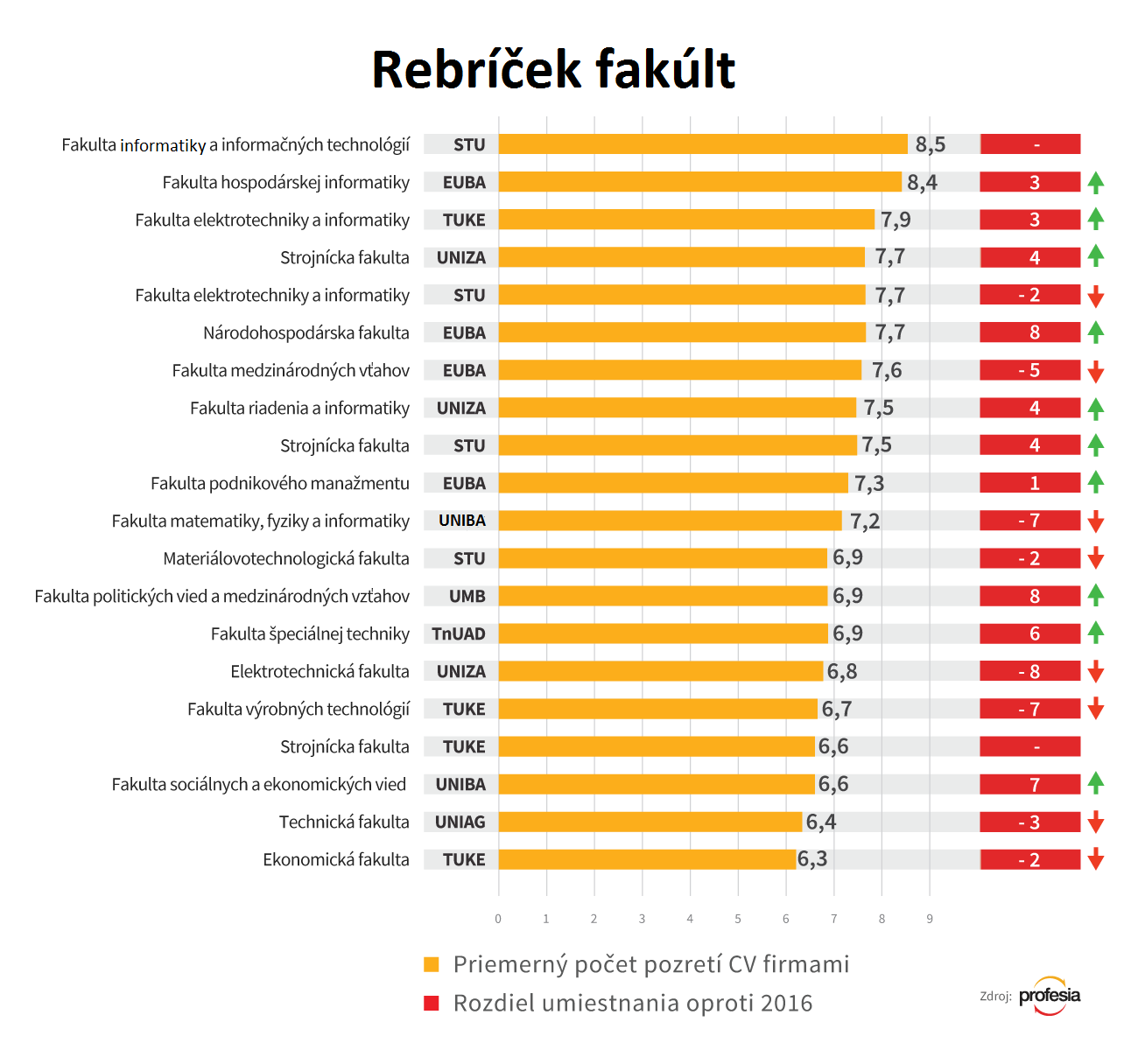 Firma Profesia zostavila rebríček verejných vysokých škôl a fakúlt už po 11. raz. Umiestnenie závisí od toho, koľko zamestnávateľov si prehliada životopisy absolventov, ktoré boli uverejnené na pracovnom portáli Profesia.sk. Rebríček tak nehodnotí úroveň vyučovania, ale zameriava sa na uplatnenie jednotlivých absolventov na trhu práce.