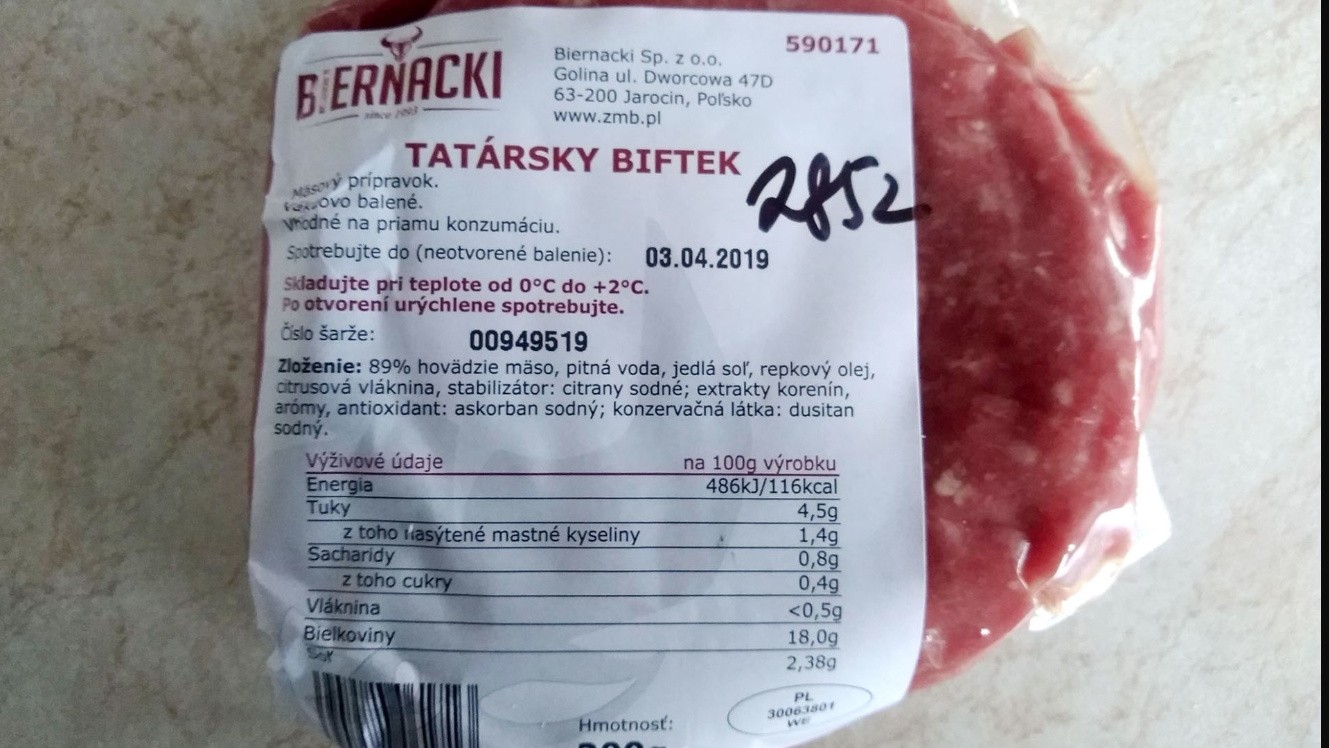Slovenskí hygienici po kontrole v obľúbenom reťazci potravín obajavili v jednom z produktov baktériu e-coli. "Na základe cielenej kontroly 23/451 zameranej na bezchybnosť hovädzieho mäsa z Poľska bola v Lidl SR v.o.s., Veľkosklad potravín, Púchovska 12, 914 41 Nemšová odobratá úradná vzorka ,,Tatársky biftek - mäsový prípravok, vákuovo balený, á 200g“ (výrobná dávka: 00949519, DS: 3.4.2019, výrobca: Zakład Przemyslu Miesnego Biernacki Sp. z o.o., Golina ul. Dworcowa 47, D 63-200 Jarocin, schvaľovacie vet. číslo: PL 30063801 WE, krajina pôvodu: Poľsko)," informovala Štátna veterinárna a potravinová správa SR na svojej stránke.