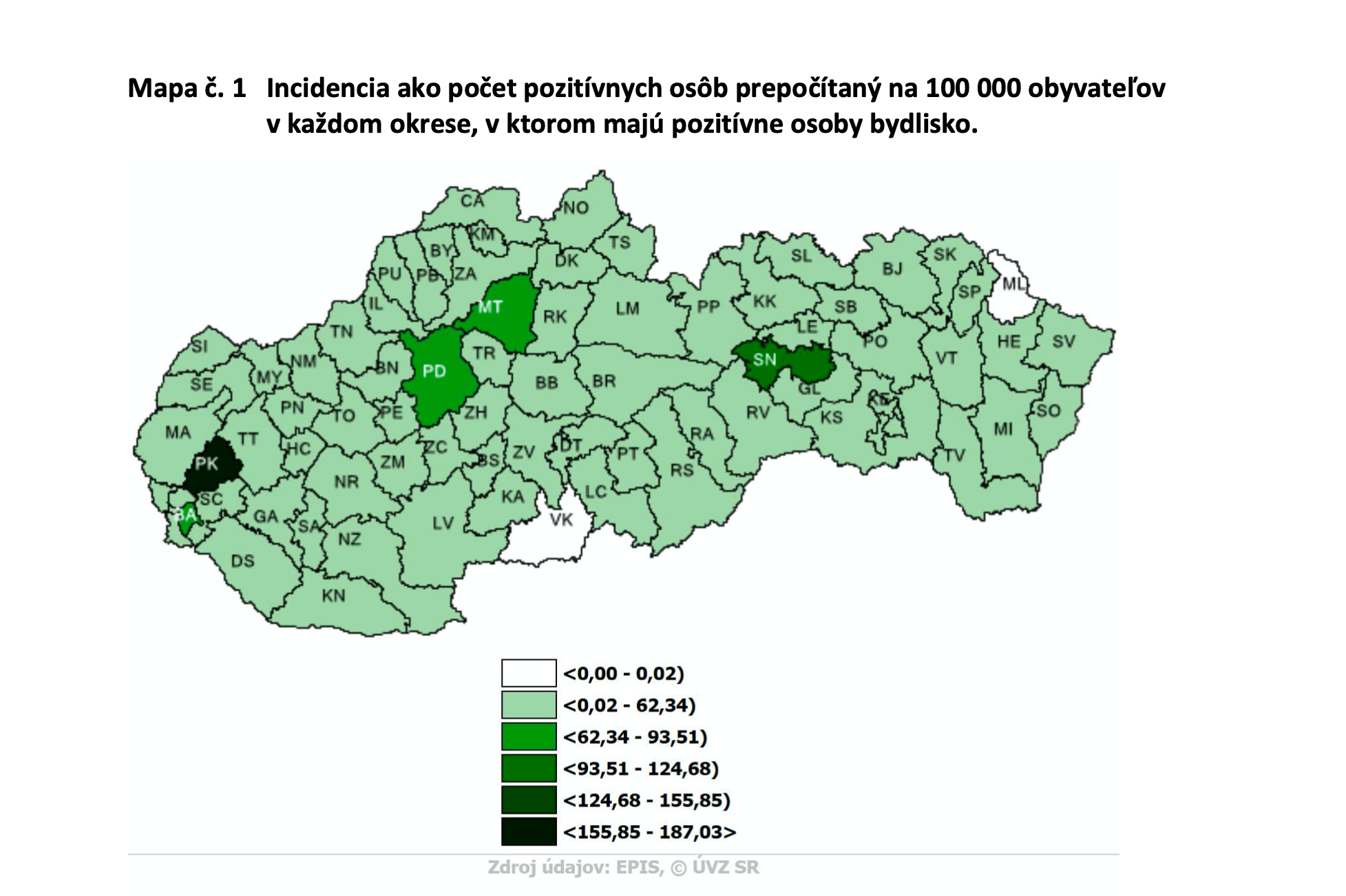 Dlhodobo najviac pozitívnych prípadov sa vyskytovalo v Bratislavskom kraji. Za ním nasleduje Trenčiansky a Košický kraj, pričom najmenej chorých sa vyskytovalo v Banskobystrickom kraji. Existujú ale 2 okresy v ktorých sa nový koronavírus neobjavil. Žiaden repatriant ani človek s trvalým bydliskom v okrese Medzilaborce a Veľký Krtíš nebol pozitívny. Najvyššiu mieru šírenia koronavírusu zaznamenali v okresoch Martin a Snina.